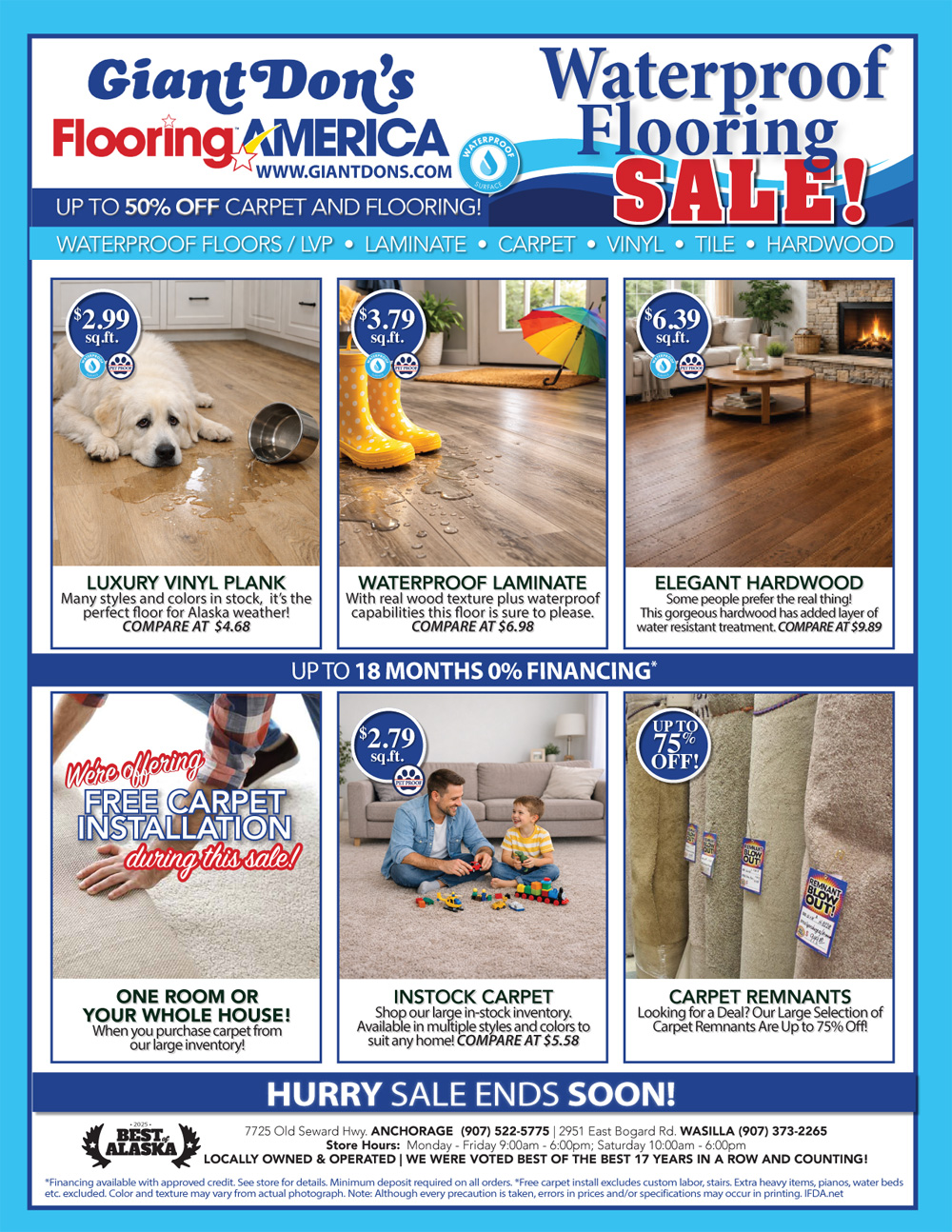 Flooring Sale at Giant Don’s Flooring America in Anchorage & Wasilla, AK – Save Big on Waterproof Floors, Carpet, Tile, and More! Looking for the best flooring prices in Anchorage, AK and Wasilla, AK? Your search ends at Giant Don’s Flooring America! Right now, we're offering huge savings on top-of-the-line flooring options including waterproof LVP (Luxury Vinyl Plank), laminate flooring, waterproof hardwood floors, carpet, and floor & wall tiles—just in time for your next home renovation project!