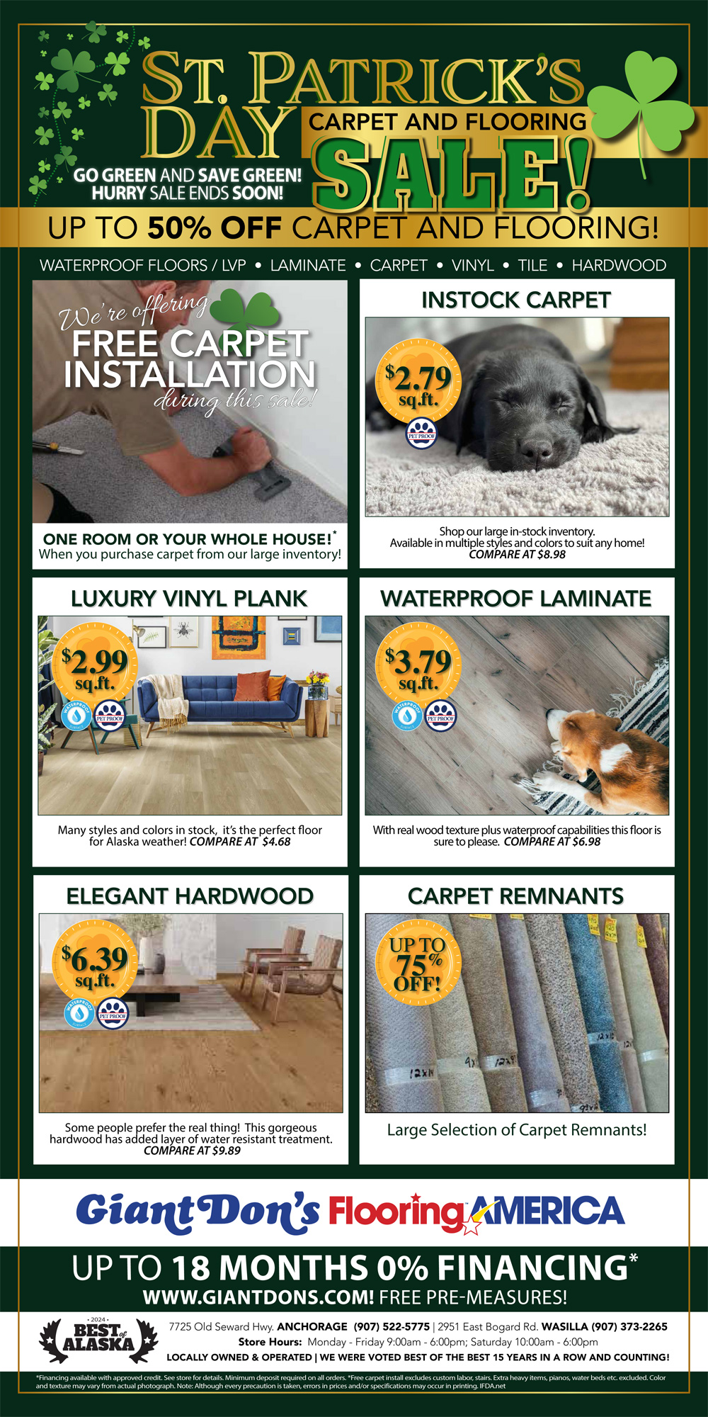 Flooring Sale at Giant Don’s Flooring America in Anchorage & Wasilla, AK – Save Big on Waterproof Floors, Carpet, Tile, and More! Looking for the best flooring prices in Anchorage, AK and Wasilla, AK? Your search ends at Giant Don’s Flooring America! Right now, we're offering huge savings on top-of-the-line flooring options including waterproof LVP (Luxury Vinyl Plank), laminate flooring, waterproof hardwood floors, carpet, and floor & wall tiles—just in time for your next home renovation project!