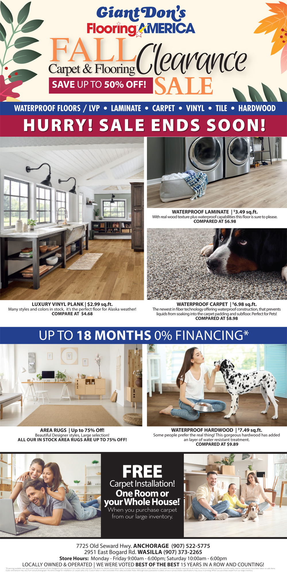 Flooring Sale at Giant Don’s Flooring America in Anchorage & Wasilla, AK – Save Big on Waterproof Floors, Carpet, Tile, and More! Looking for the best flooring prices in Anchorage, AK and Wasilla, AK? Your search ends at Giant Don’s Flooring America! Right now, we're offering huge savings on top-of-the-line flooring options including waterproof LVP (Luxury Vinyl Plank), laminate flooring, waterproof hardwood floors, carpet, and floor & wall tiles—just in time for your next home renovation project!