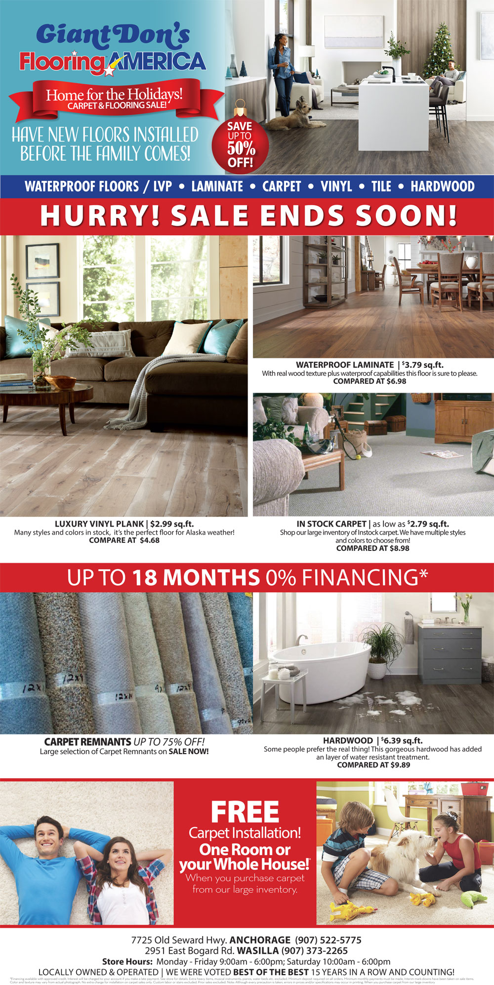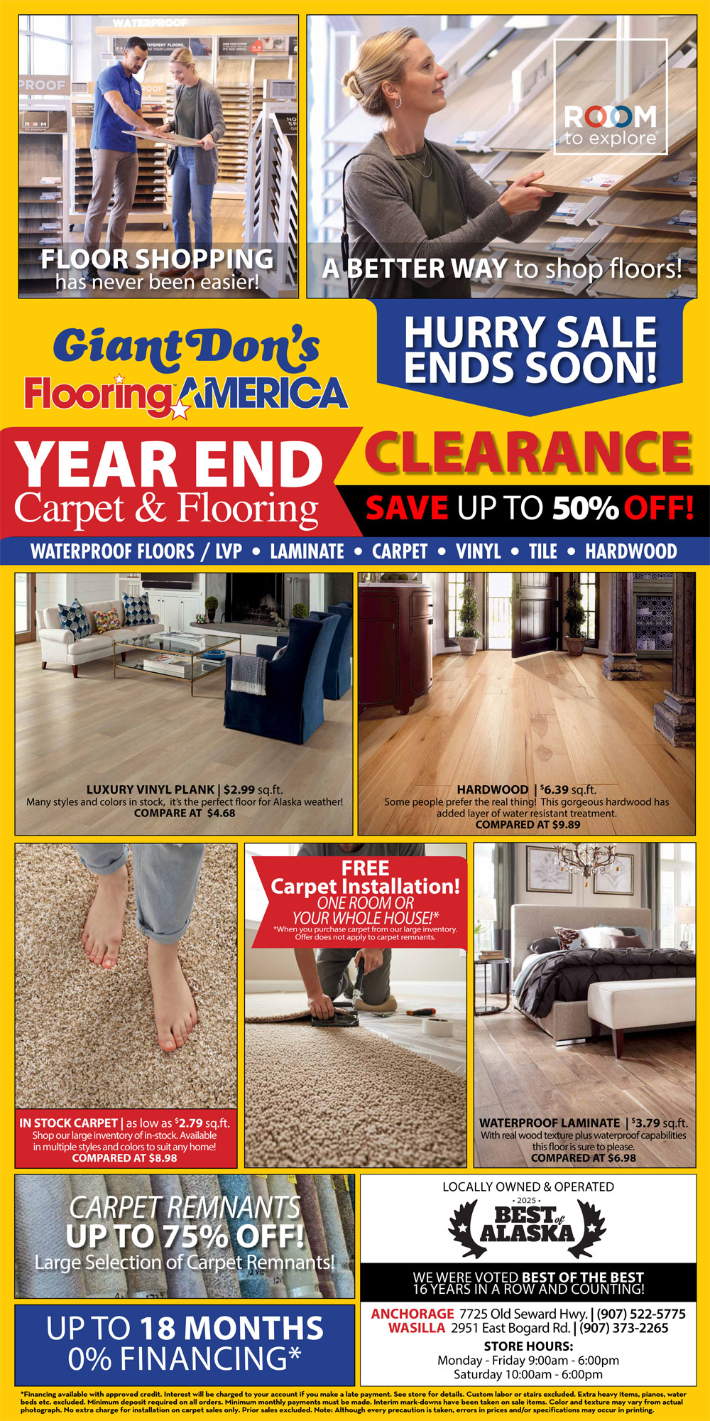 Flooring Sale at Giant Don’s Flooring America in Anchorage & Wasilla, AK – Save Big on Waterproof Floors, Carpet, Tile, and More! Looking for the best flooring prices in Anchorage, AK and Wasilla, AK? Your search ends at Giant Don’s Flooring America! Right now, we're offering huge savings on top-of-the-line flooring options including waterproof LVP (Luxury Vinyl Plank), laminate flooring, waterproof hardwood floors, carpet, and floor & wall tiles—just in time for your next home renovation project!